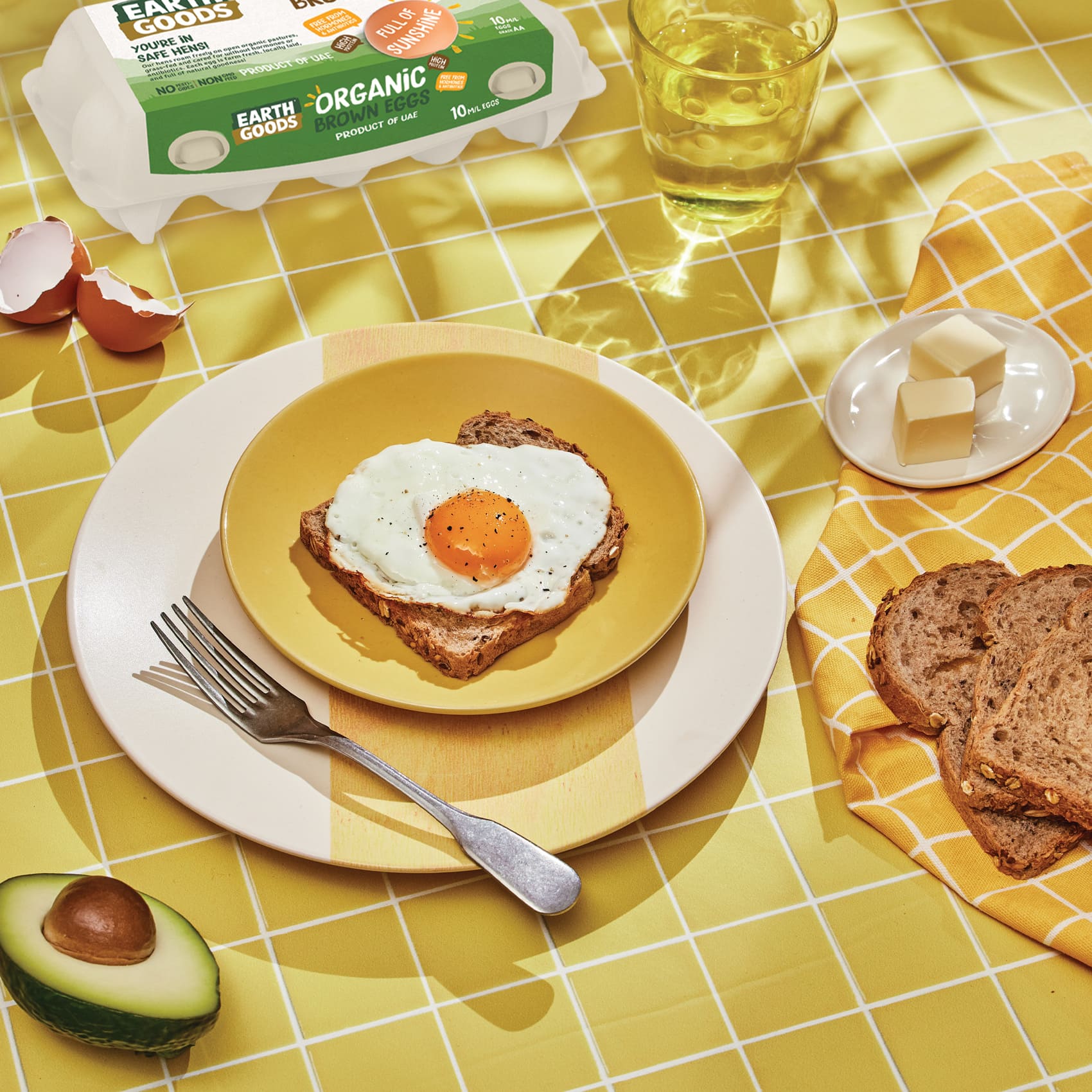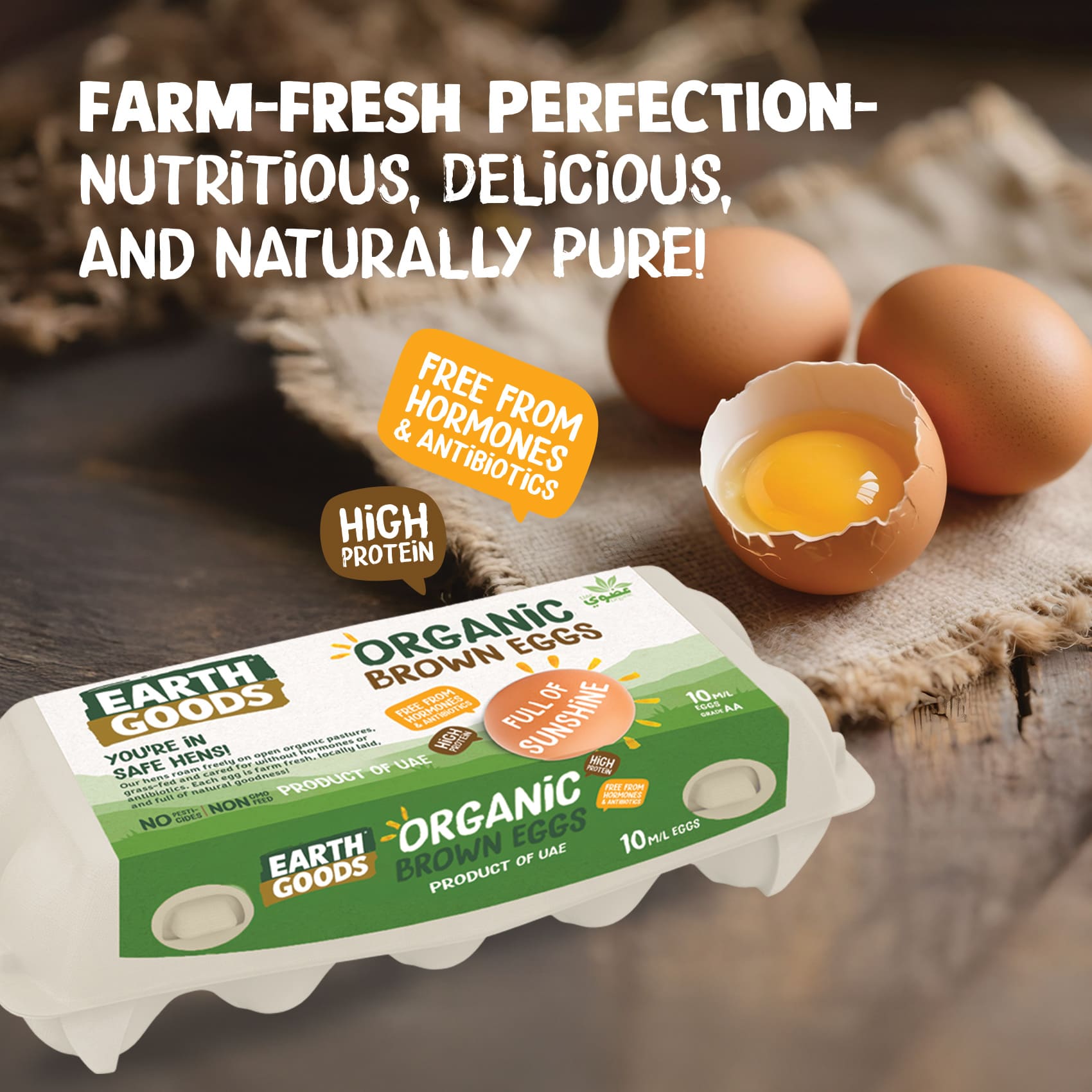 Earth Goods brown eggs are fresh from dedicated family farms that are committed to the highest organic standards. Every bird is fed only organic feed and given access to the outdoors all 365 days of the year