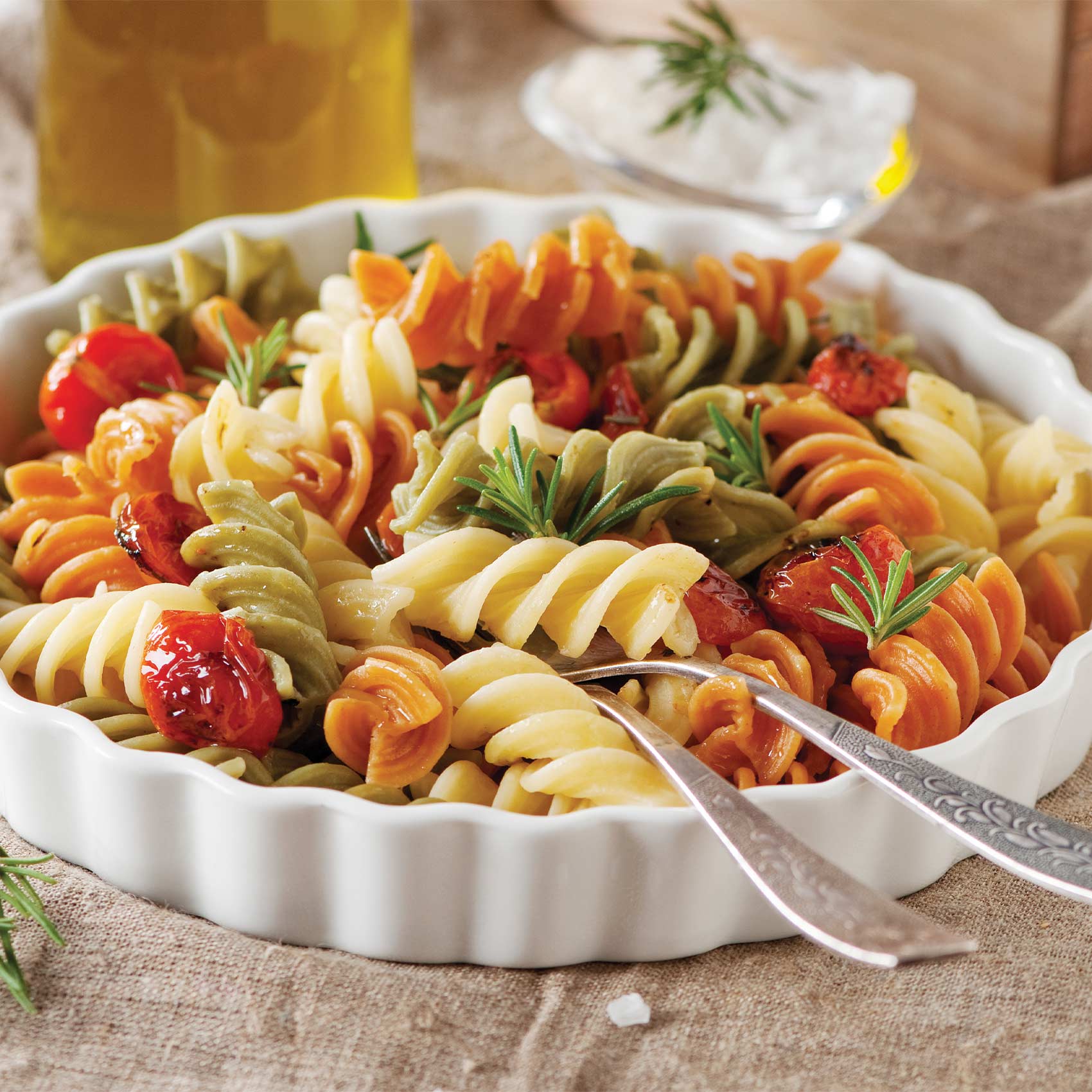 Let colors inspire your cooking! Perfect al dente in 9 minutes, these spirals hold sauce beautifully. Ideal for pasta salads, baked dishes, or simple olive oil toss!